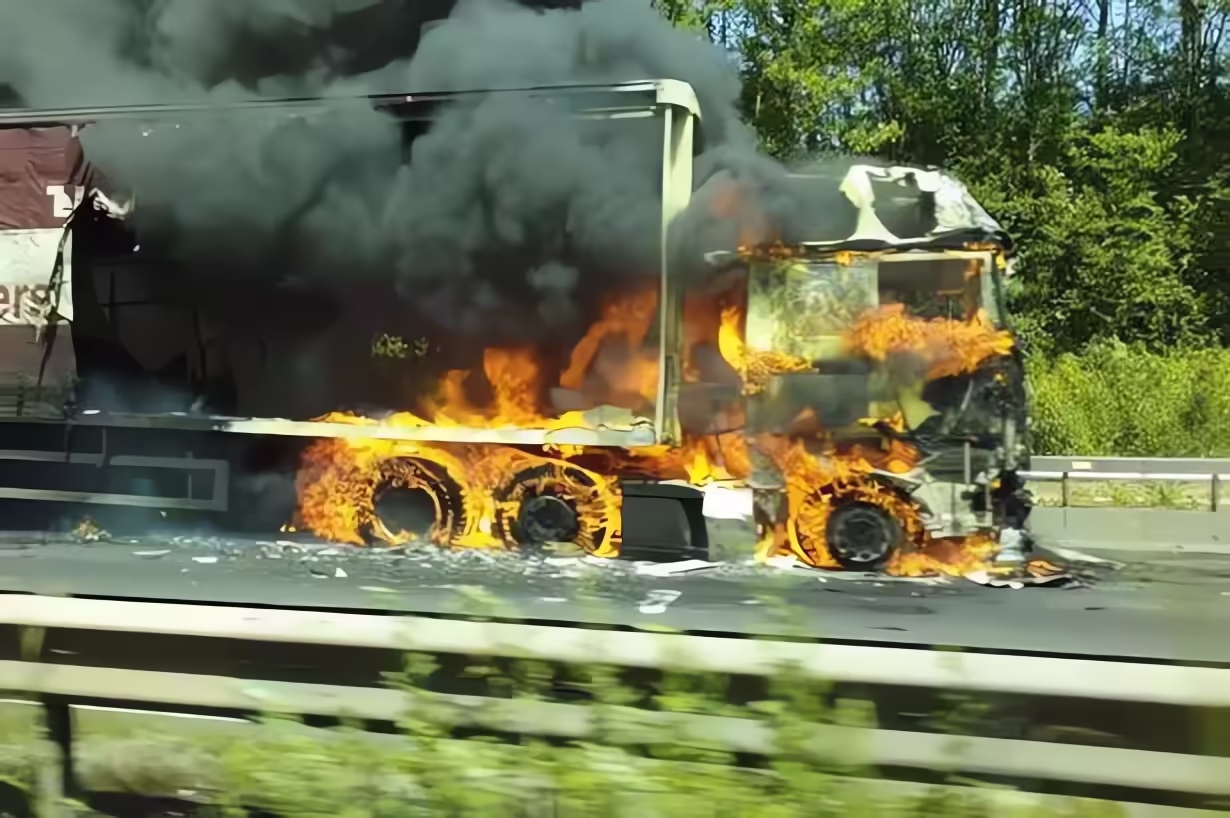 Riktig alternativ er nummer 3. Brann i kjøretøy kan oppstå i det elektriske anlegget (særlig ved feil dimensjonerte eller feilmonterte sikringer, dårlige kontakter eller kortslutning), i drivstoffsystemet ved lekkasjer eller søl, og i bremsene på grunn av varmgang. De fleste bilbranner starter i motorrommet, derfor er påstanden om at det sjelden brenner der feil. I tunge kjøretøy ses ofte branner i hjul og dekk etter varmgang i bremser eller hjullager; slike branner er vanskelige å slokke uten store mengder vann for nedkjøling. Påstanden om at branner for det meste skjer i kjøretøy med farlig gods er også feil; slike transporter utgjør en liten del av trafikken, og brannårsakene er de samme som i andre kjøretøy. Sikringer reduserer risikoen, men de eliminerer den ikke; feil sikringer eller omgåelser kan tvert imot øke faren for brann.